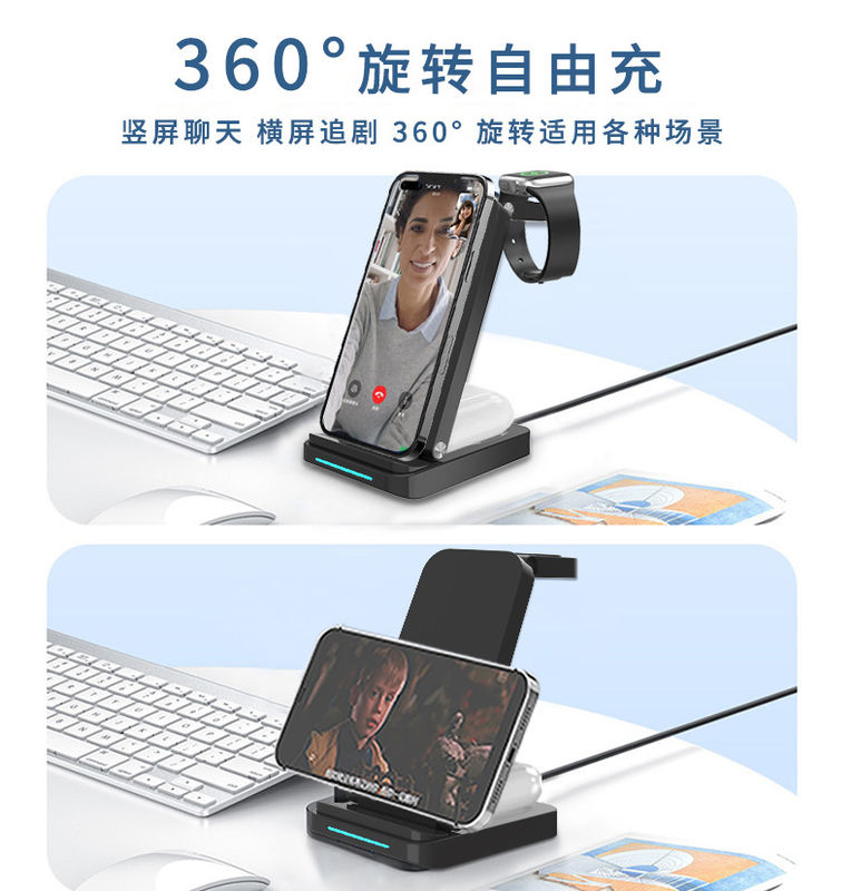 요약하면, 이 3-in-1 무선 충전기는 독특한 디자인, 다기능 통합, 편리한 유연성, 안전 및 안정성, 광범위한 호환성 및 기타 특징으로 사용자에게 효율적이고 편리하며 안전한 충전 경험을 제공합니다. 개인 사용자이든 비즈니스 사용자이든, 요구 사항을 충족하는 충전 솔루션을 얻을 수 있습니다.