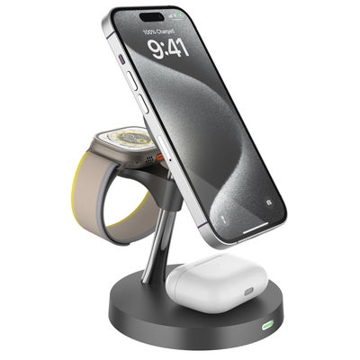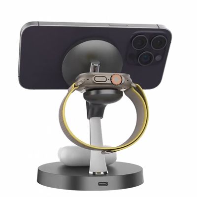 이 제품은 Qi 표준 올인원 다기능 자기 고속 무선 충전기로, iPhone12/13/14/15 시리즈 자기 기능 휴대폰, Apple Watch, Samsung Watch, 기타 QI 표준 휴대폰, Airpods 및 Samsung TWS를 지원할 수 있습니다. 편리하고 실용적인 스마트 전자 장치입니다. 이 제품의 자기 부분은 자기 코일 디자인을 채택합니다. 휴대폰을 충전하는 동안 휴대폰을 수직 또는 수평으로 놓을 수 있습니다. 충전하면서 좋아하는 동영상을 시청할 때 충전 부분을 위아래로 조정하여 적절한 각도를 찾을 수 있습니다. 제품은 자기 이중 코일로 설계되었으며 이러한 다중 각도 조절이 가능하며 충전에 영향을 주지 않고 휴대폰을 수직 또는 수평으로 배치할 수 있습니다.